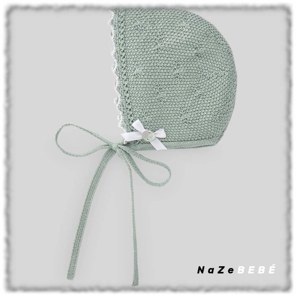 ¡¡OUTLET!! Capota para bebé de la marca Paz Rodríguez en color verde menta con punto trabajado y combinado con detalle a contraste en blanco. Lazo lateral decorativo con placa de la marca y cierre con lazada.