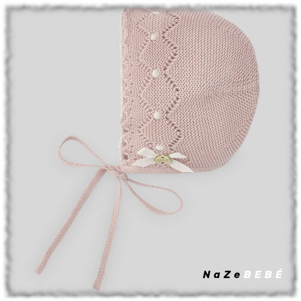 ¡¡OUTLET!! Capota para bebé de la marca Paz Rodríguez en rosa maquillaje/crudo de punto bobo con rombos calados y detalles a contraste. Lazo lateral decorativo con placa de la marca y cierre con lazada.