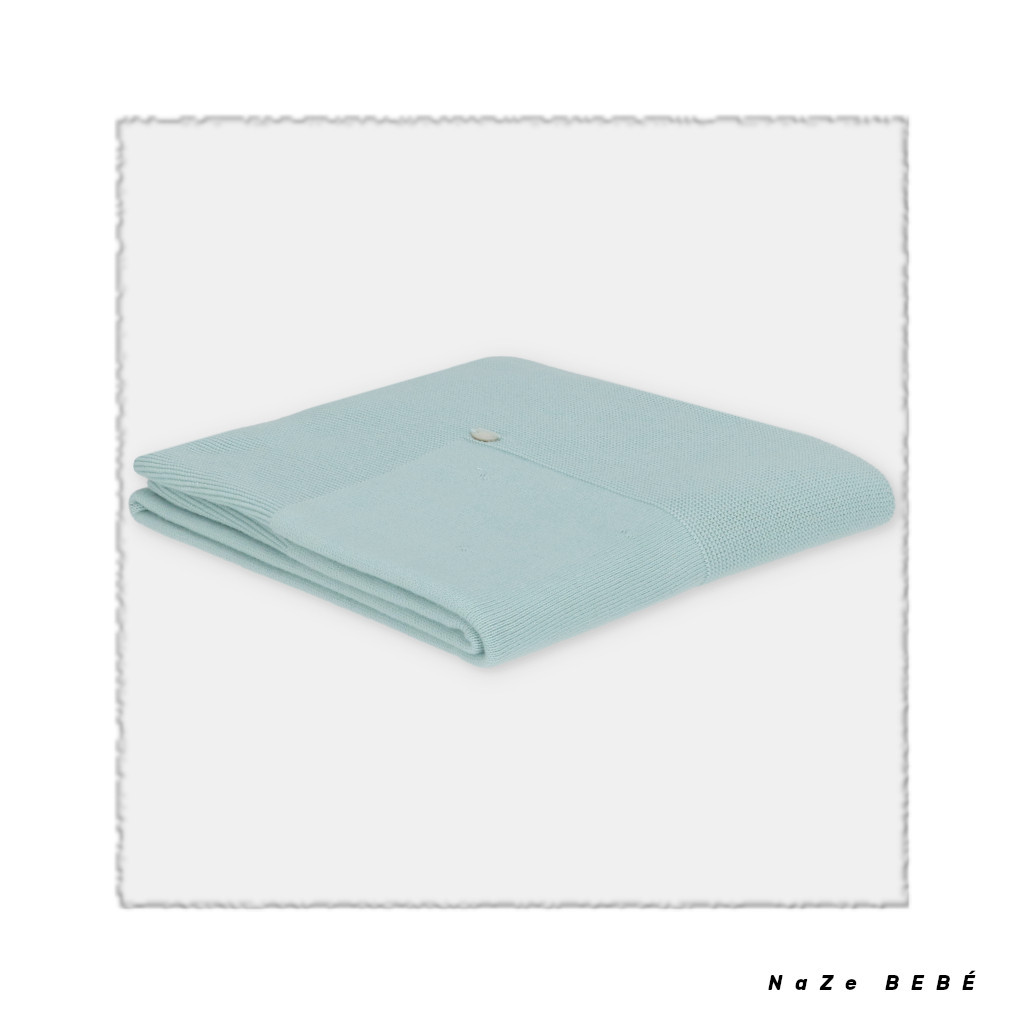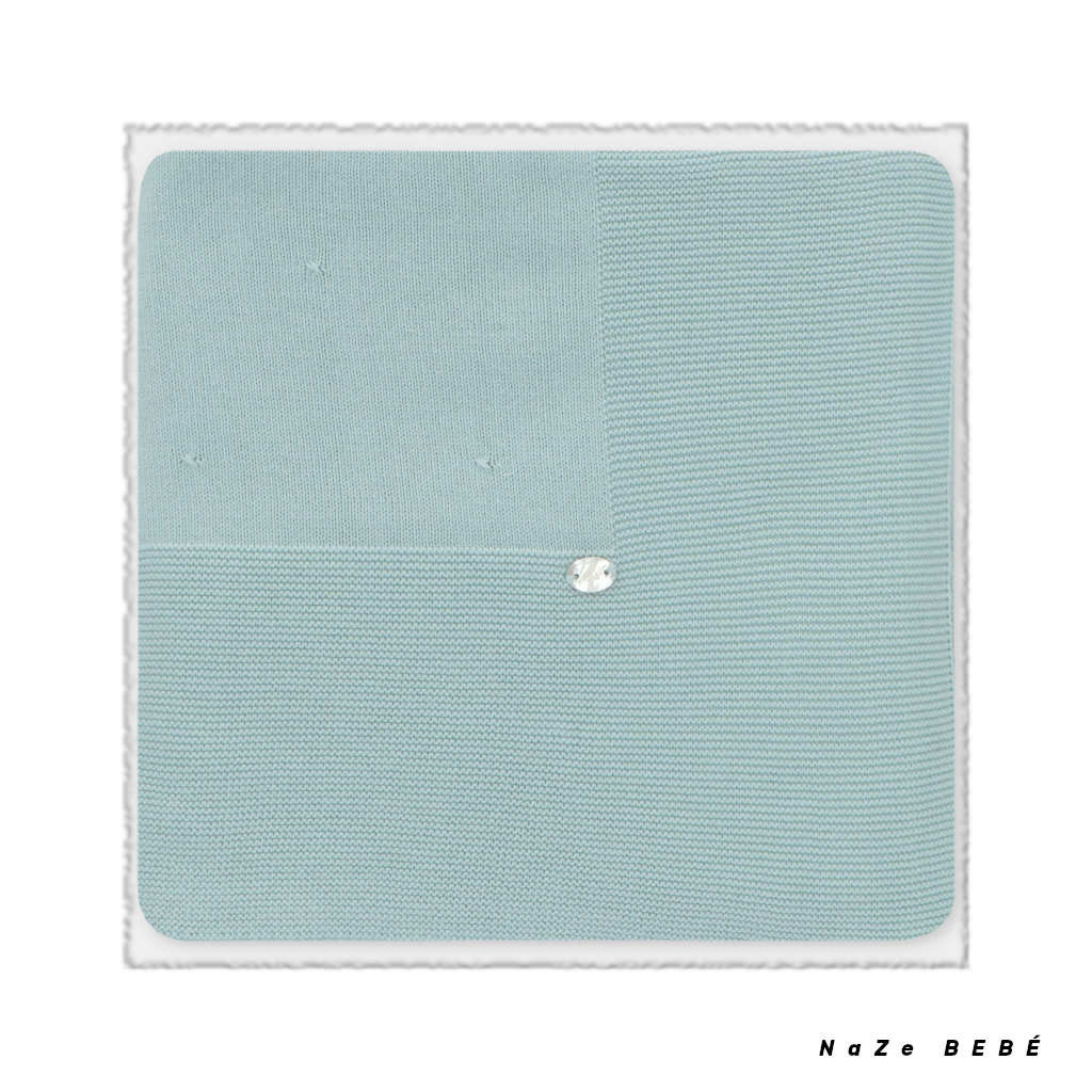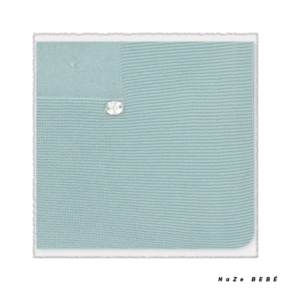 ¡¡REBAJAS 20% DE DESCUENTO!! COLECCIÓN VERANO 2024. Toquilla de punto para bebé en color verde agua con detalles de punto espigado y placa decorativa de la marca.