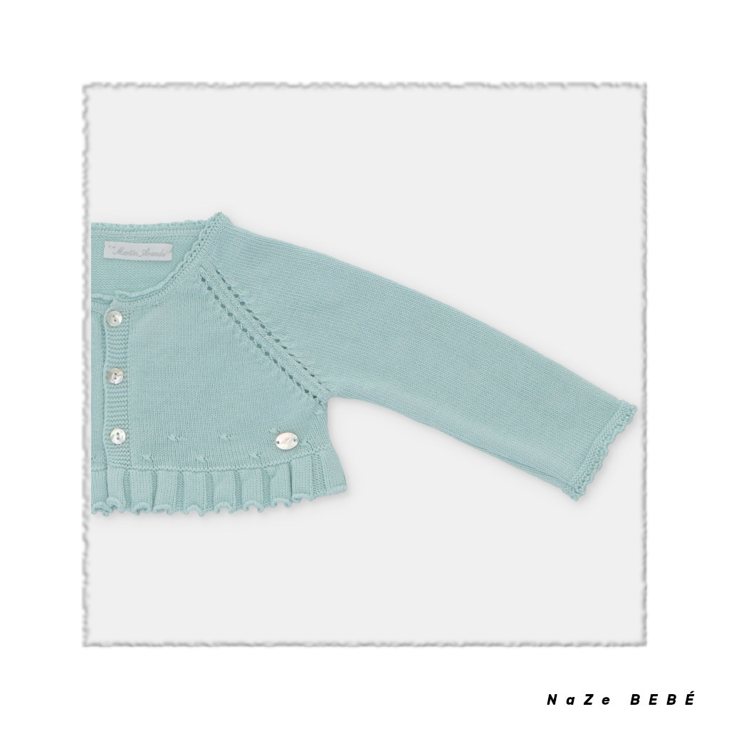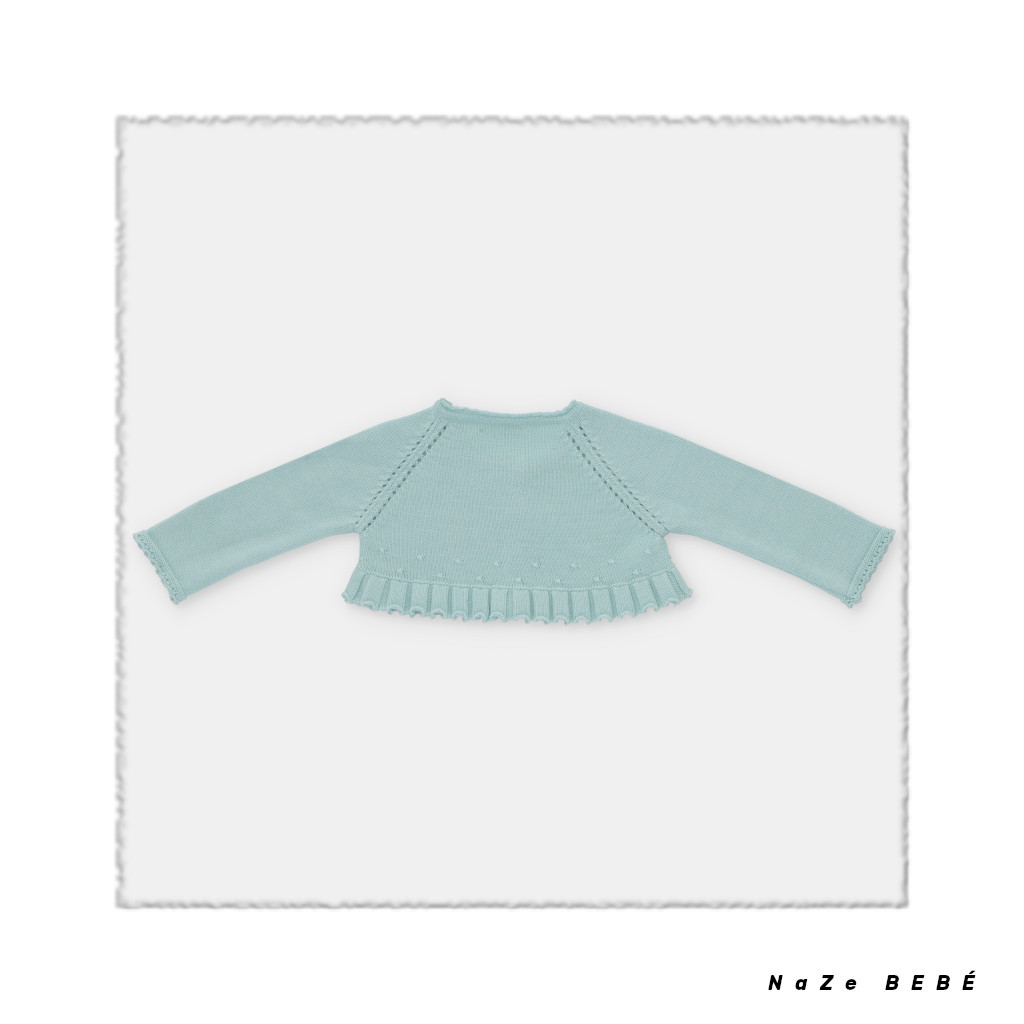 ¡¡REBAJAS 20% DE DESCUENTO!! COLECCIÓN VERANO 2024. Chaqueta corta de punto para bebé con detalles de punto calado, bodoques y volante plisado en bajo. Placa decorativa con logo de la marca.