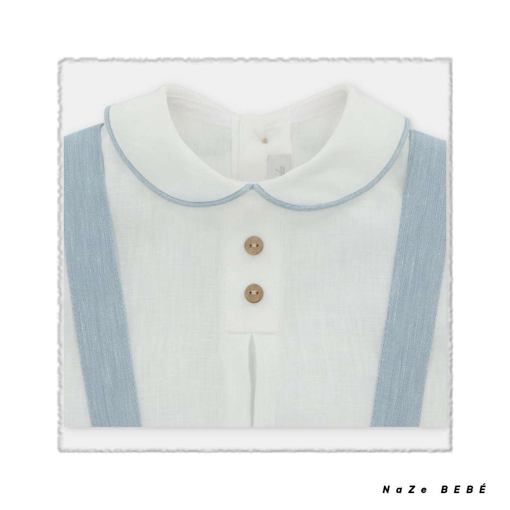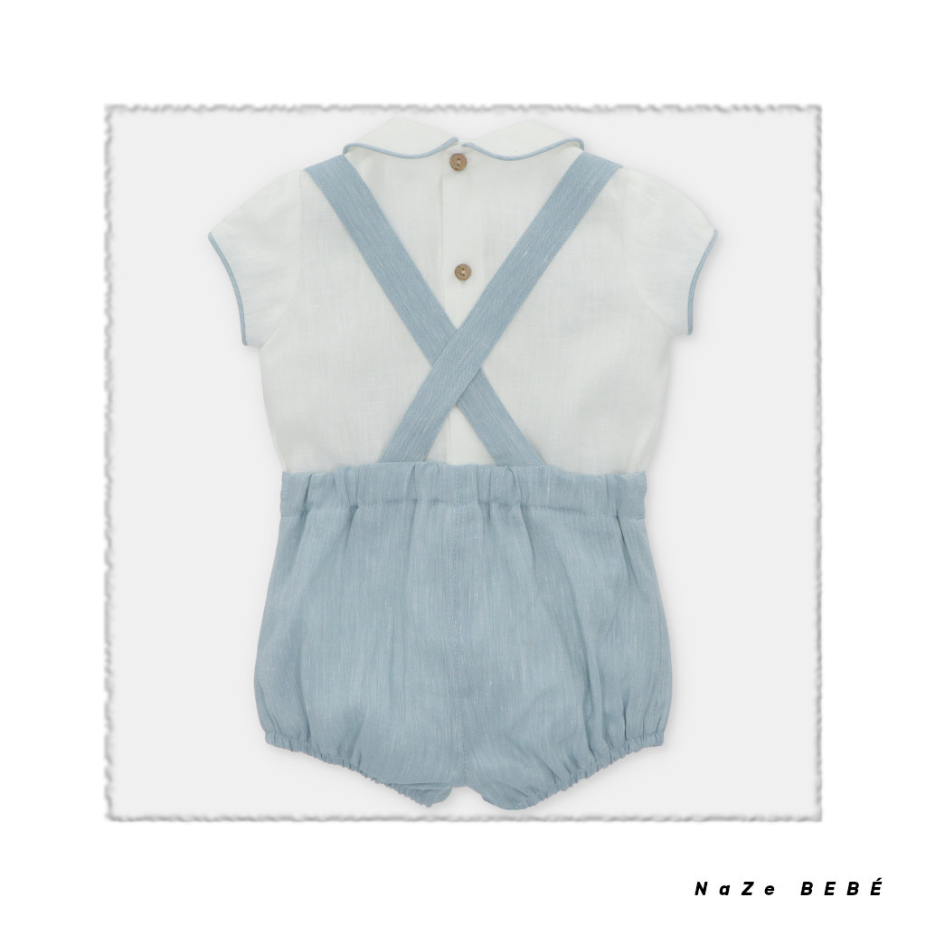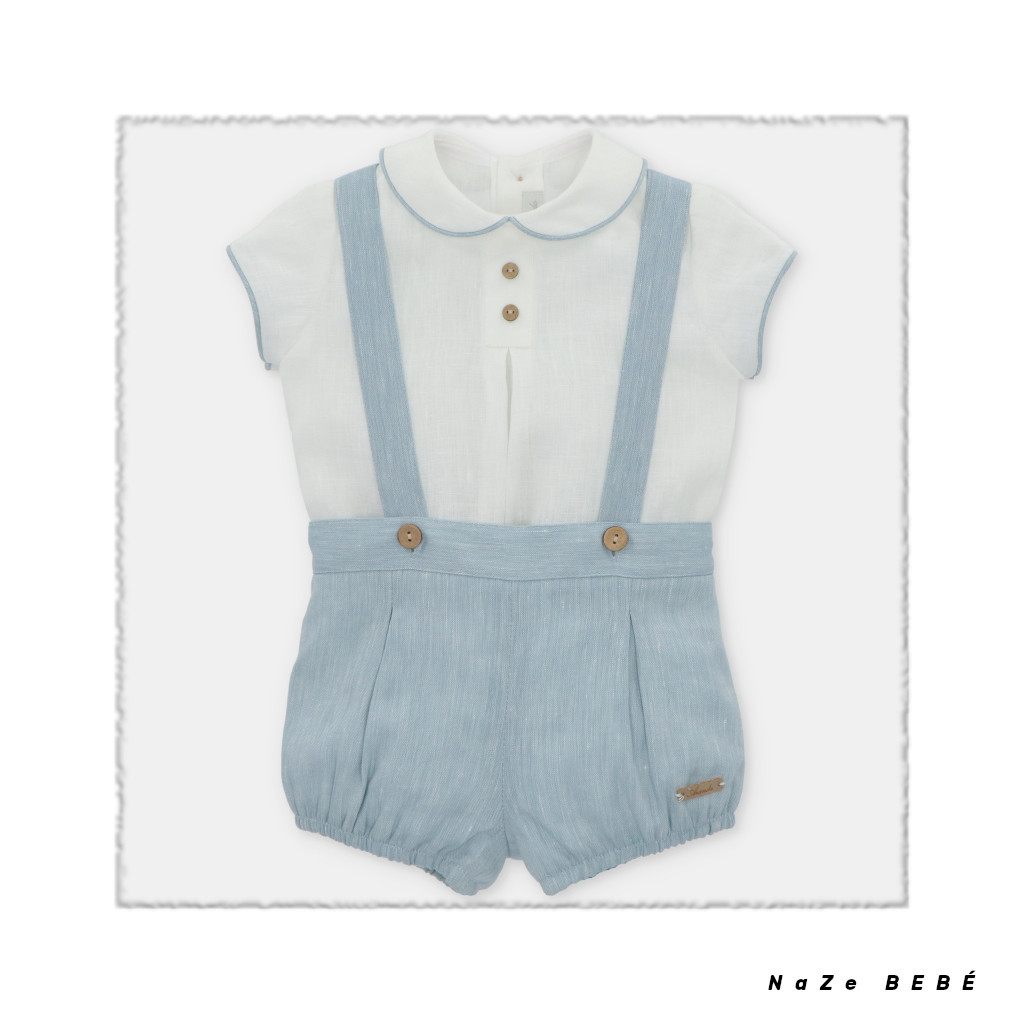¡¡REBAJAS 20% DE DESCUENTO!! COLECCIÓN VERANO 2024. Conjunto de bombacho compuesto por camisa cuello bebé con borde en color azul empolvado en mangas y cuello. Bombacho de tirantes en color azul empolvado con detalle de parche de napa con logo de la marca en el bajo.