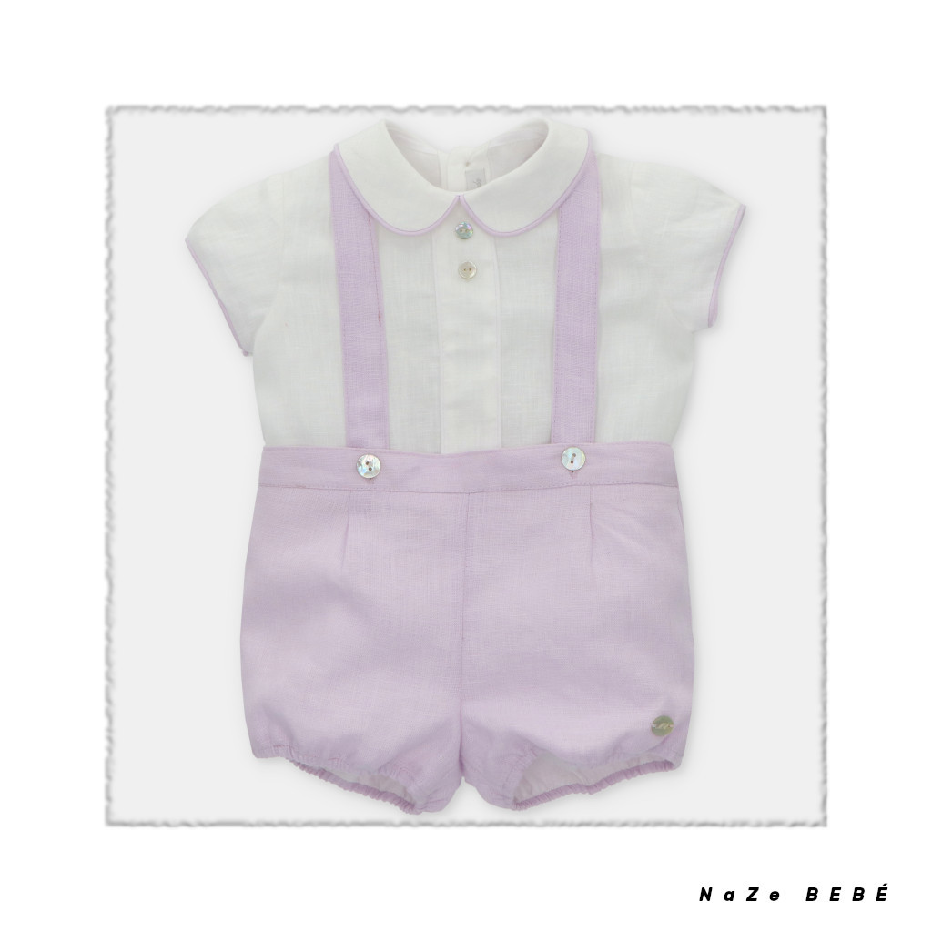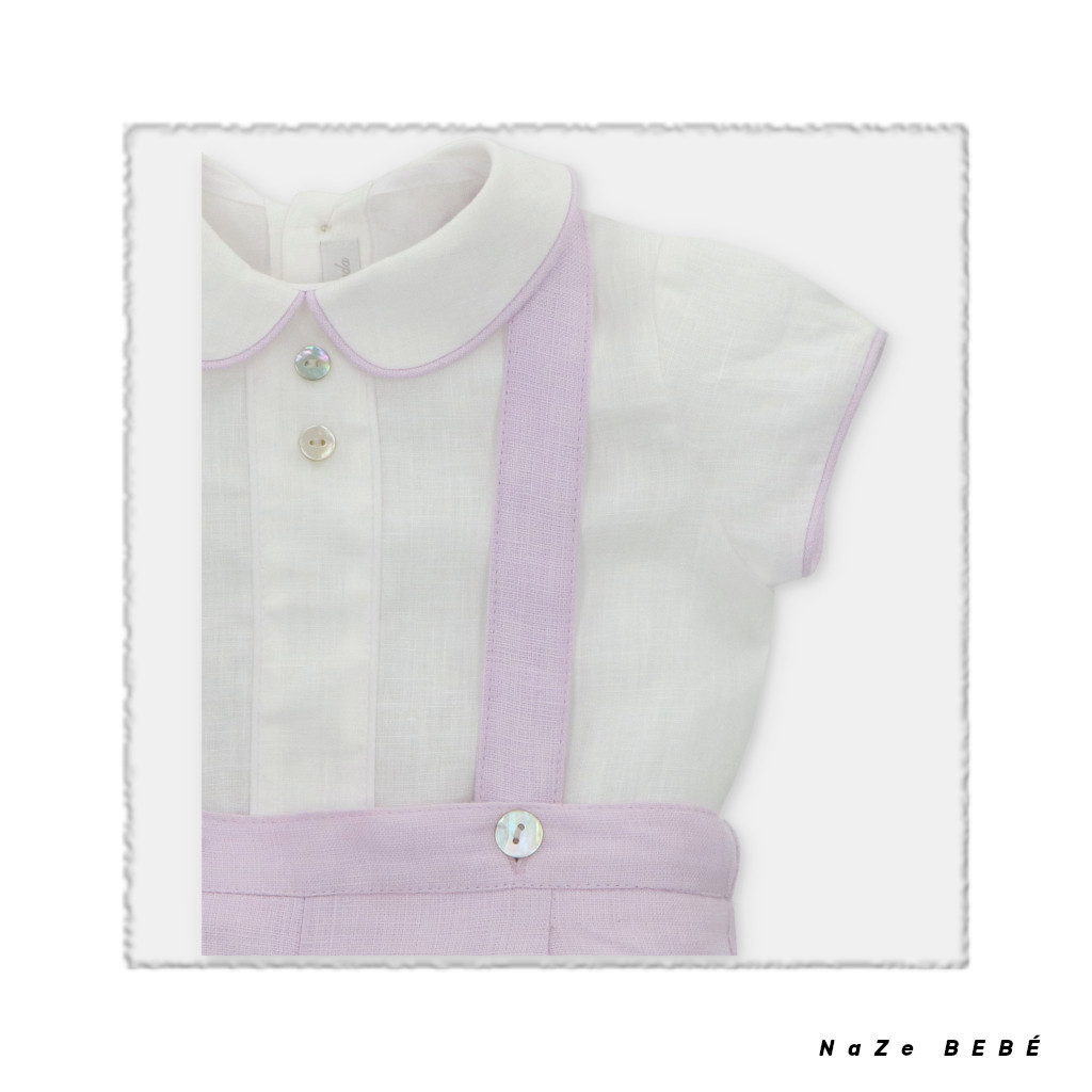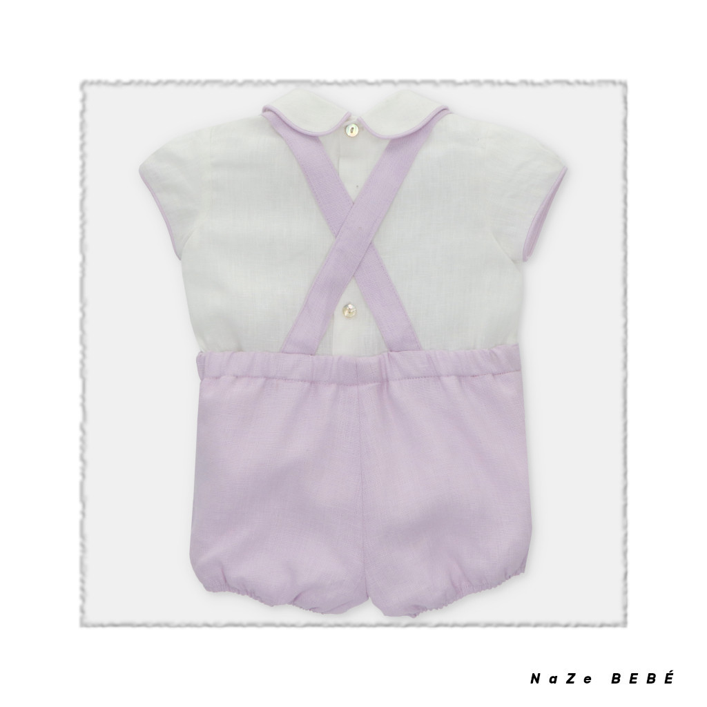 ¡¡REBAJAS 20% DE DESCUENTO!! COLECCIÓN VERANO 2024. Conjunto de bombacho compuesto por camisa cuello bebé con borde en color lavanda en mangas y cuello. Bombacho de tirantes en color lavanda con detalle de placa decorativa de la marca en el bajo.