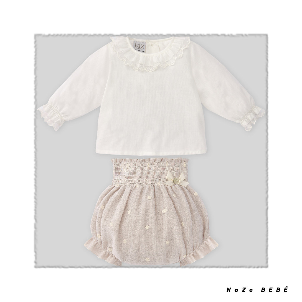 ¡¡REBAJAS 20% DE DTO!! COLECCIÓN INVIERNO 2024. Conjunto de braguita para bebé de la marca española Paz Rodríguez en lino/crudo. Blusa de manga larga con cuello volante y rematada de puntillas. Cierre trasero con botones. Cubrepañal de bodoques bordados con un toque clásico y perfecto para eventos y ocasiones especiales. Cinturilla elástica con nido de abeja para mayor confort.