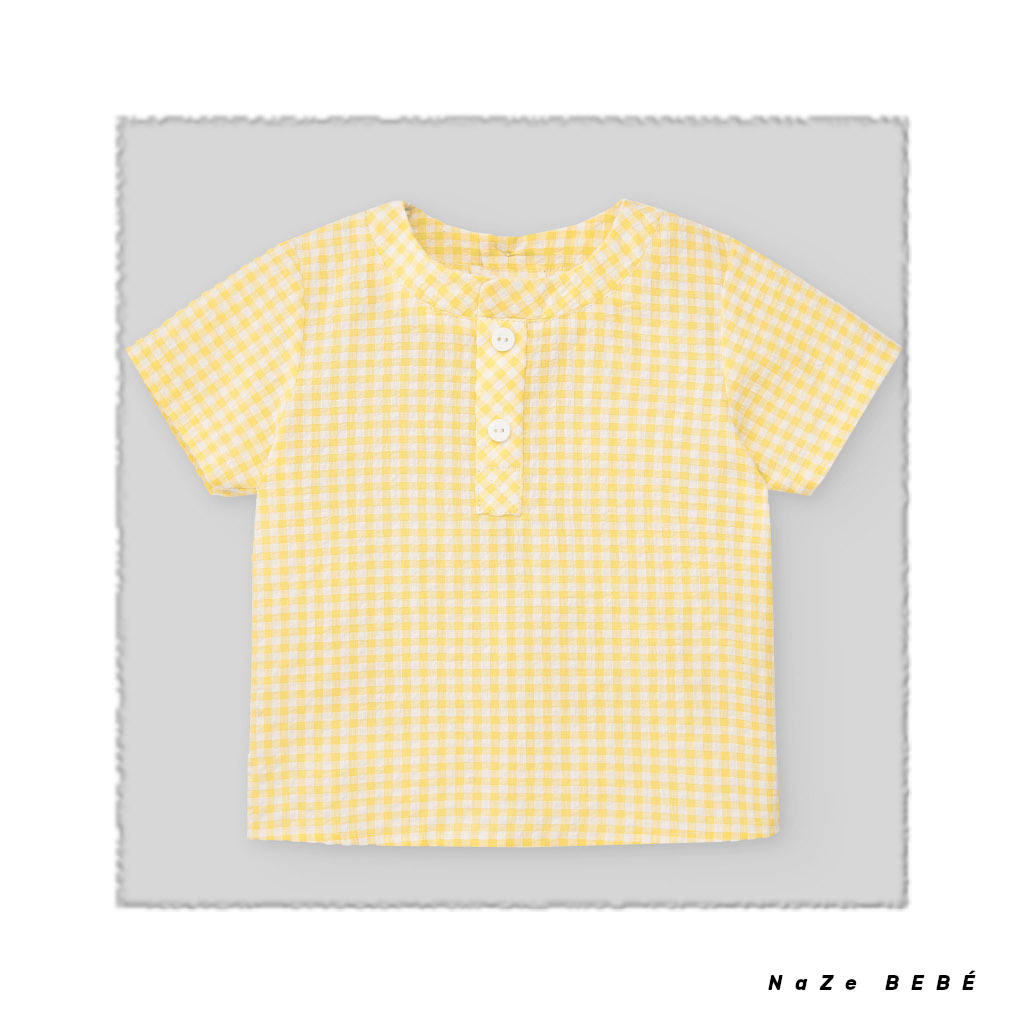 ¡¡REBAJAS 20% DE DESCUENTO!! COLECCIÓN VERANO 2024. Conjunto dos piezas para bebé en amarillo/blanco compuesto de peto de corte alto y tirantes cruzados en espalda. Cierre mediante botones delanteros. Camisa con estampado vichy de cuello redondo y botones en canesú.