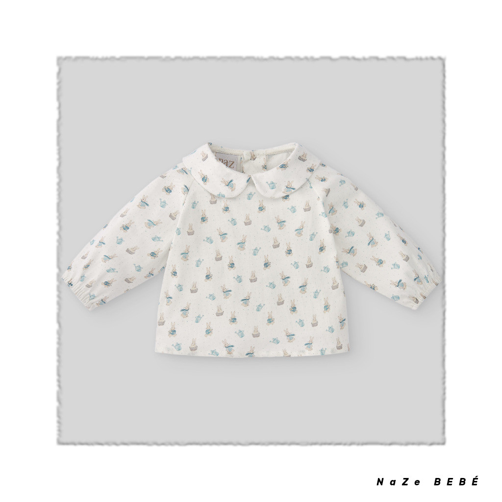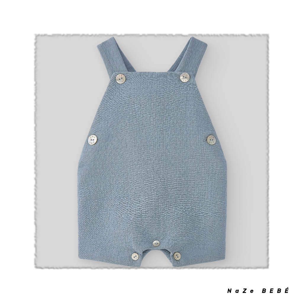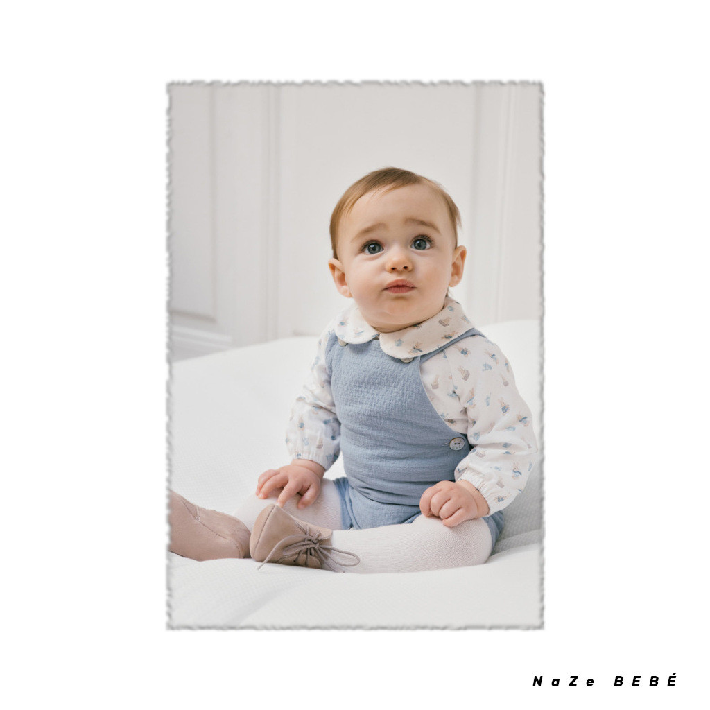 ¡¡REBAJAS 20% DE DTO!! COLECCIÓN INVIERNO 2024. Conjunto de peto para bebé de la marca española Paz Rodríguez en azul niebla. Peto corto de tirantes con botones de nácar y laterales para un mayor confort. Abertura en la entrepierna para facilitar el cambio de pañal. Blusa de algodón cuello bebé con estampado de conejitos y pequeños topitos. Cierre en la espalda con botones.