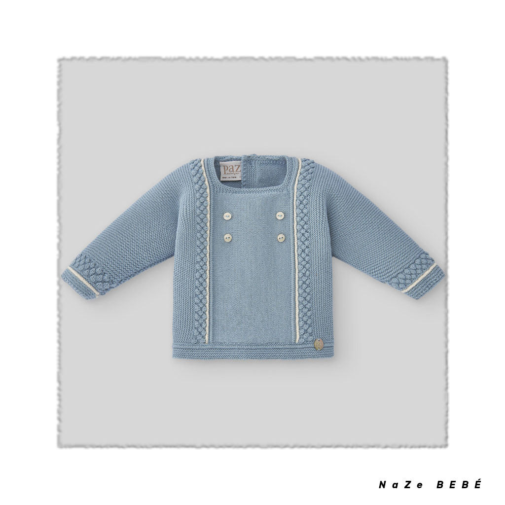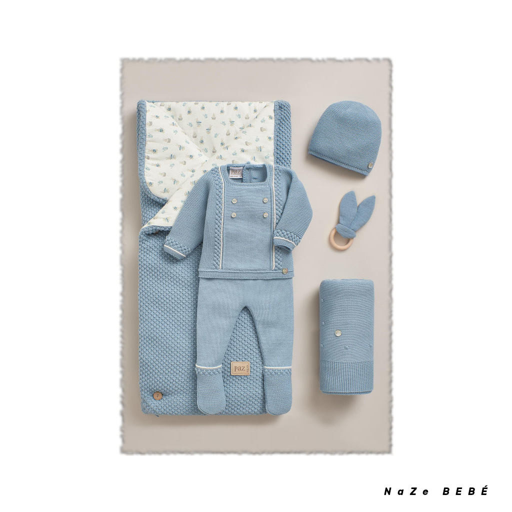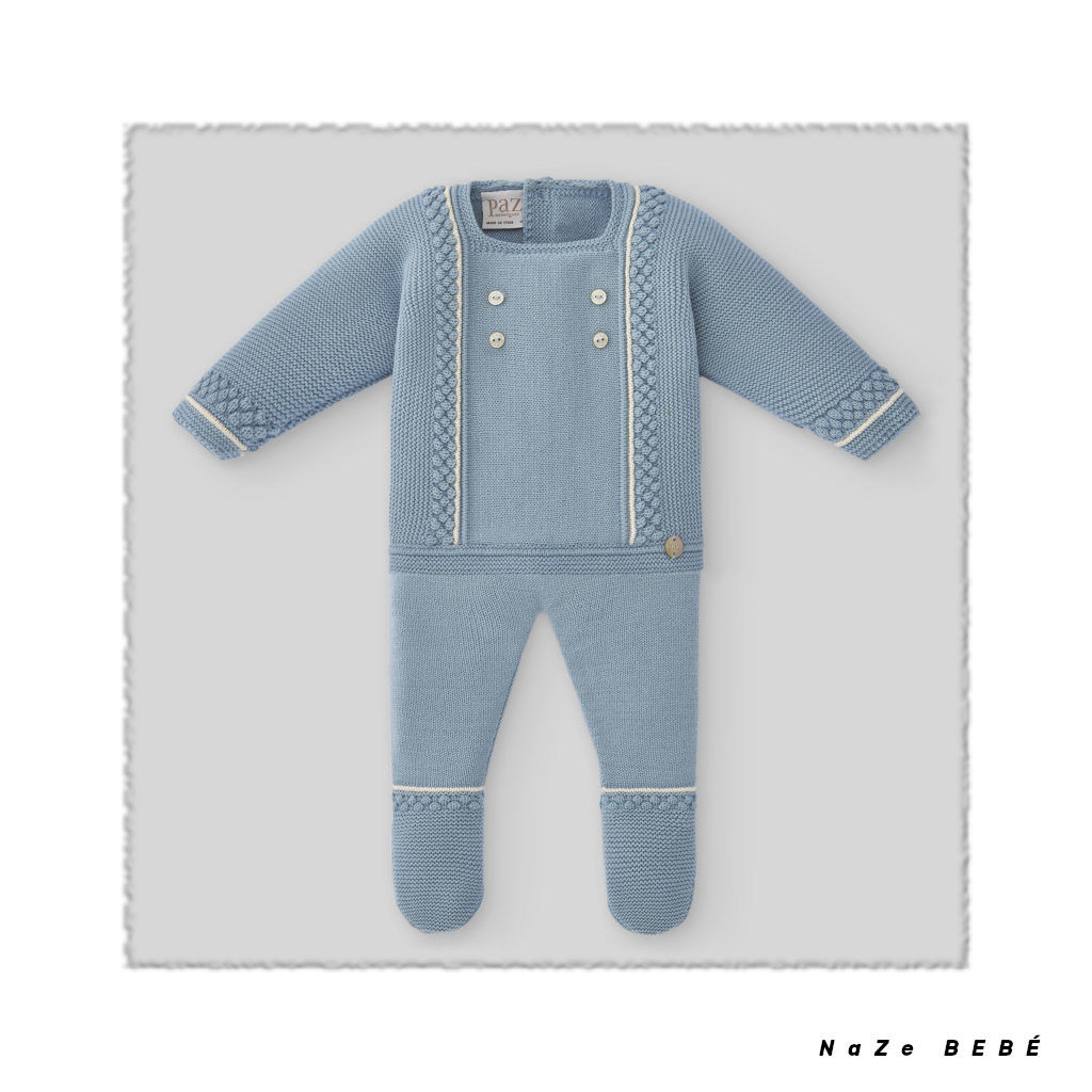 ¡¡REBAJAS!! Conjunto de polaina para bebé de la marca española Paz Rodríguez en azul niebla. Jubón de punto con botones decorativos y cenefas en la parte frontal y puños. Placa decorativa de la marca y cierre en la espalda con botones a tono. Polaina a juego.