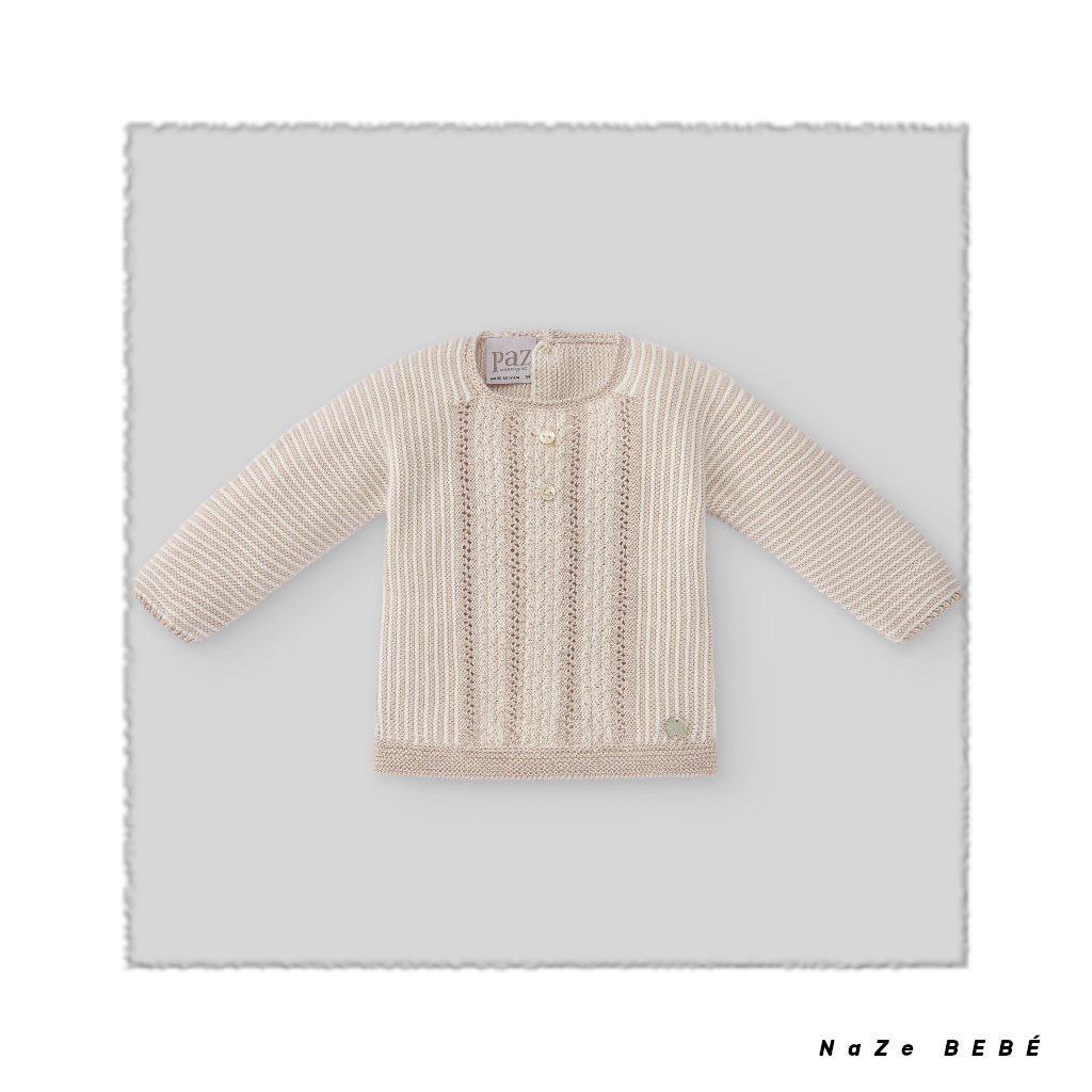 ¡¡REBAJAS!! Conjunto de polaina para bebé de la marca española Paz Rodríguez en lino/crudo. Jubón de cuello redondo con dibujo de listas en punto calado y placa decorativa de la marca. Polaina a juego.
