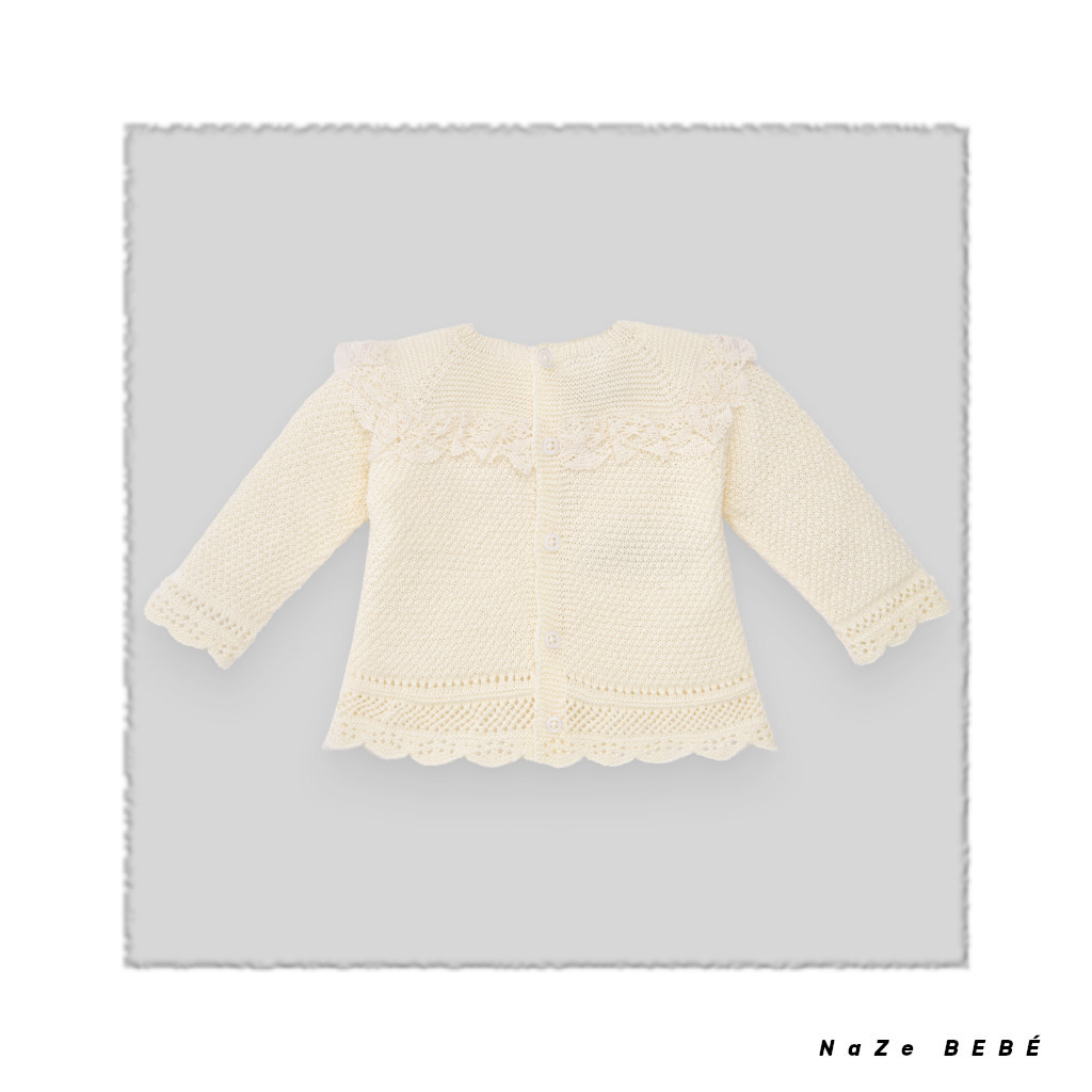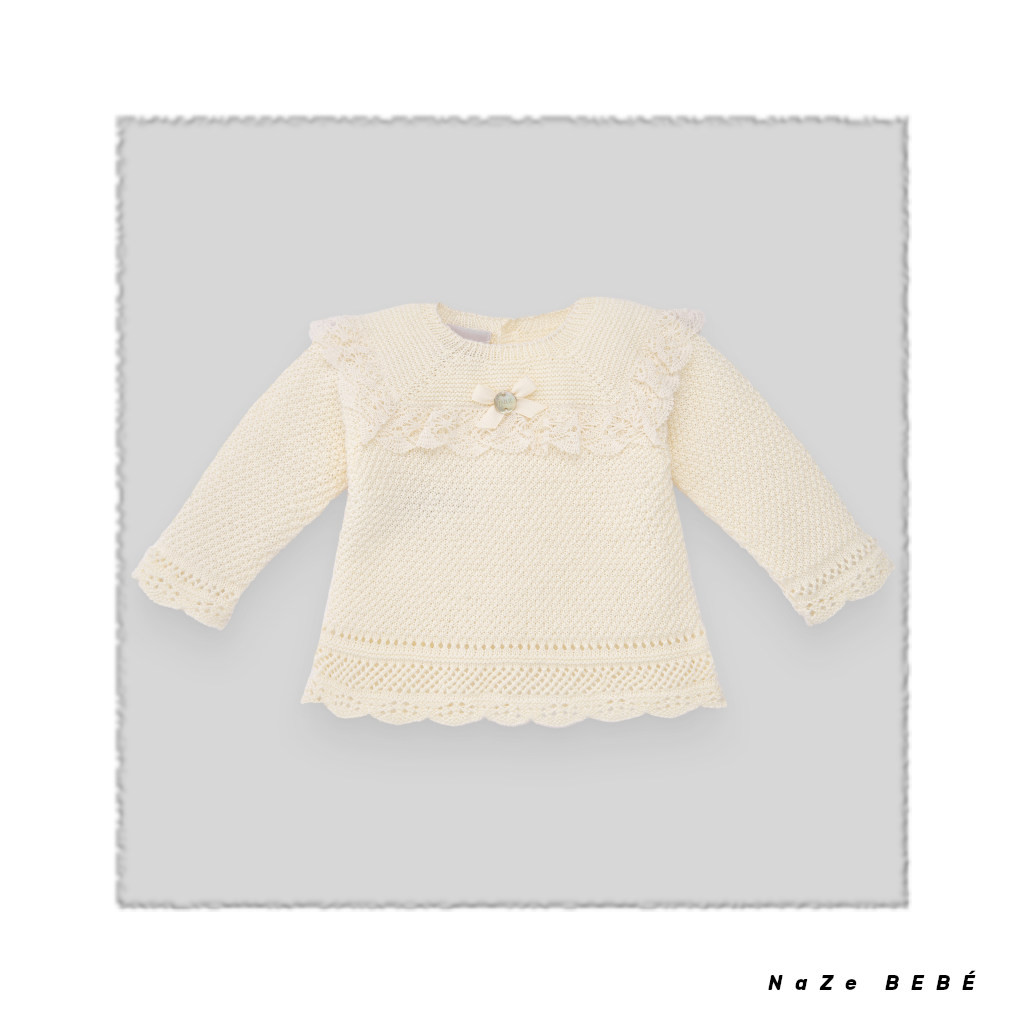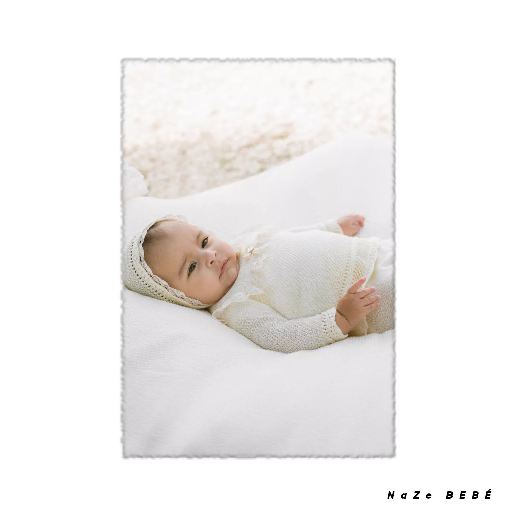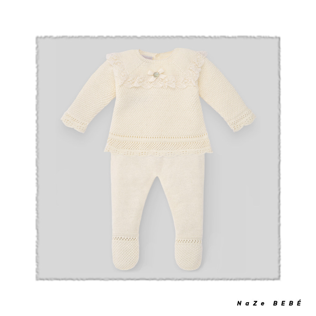 ¡¡REBAJAS!! Conjunto de polaina para bebé en color beige. Jubón de punto con cuello redondo y remates de ondas. Cierre trasero con botones. Detalle de puntillas y pequeño lazo decorativo al tono con placa de la marca. Polaina a juego.