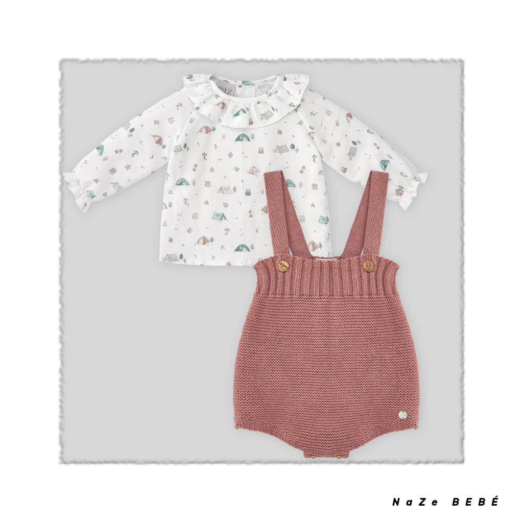 ¡¡REBAJAS 20% DE DTO!! COLECCIÓN INVIERNO 2024. Conjunto de ranita para bebé de la marca española Paz Rodríguez en color teja. Ranita corta de punto con tirantes y cinturilla elástica. Cierre con botones en entrepierna para facilitar el cambio de pañal. Blusa estampada con cuello volante.