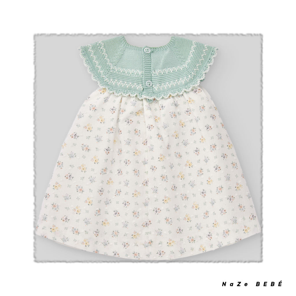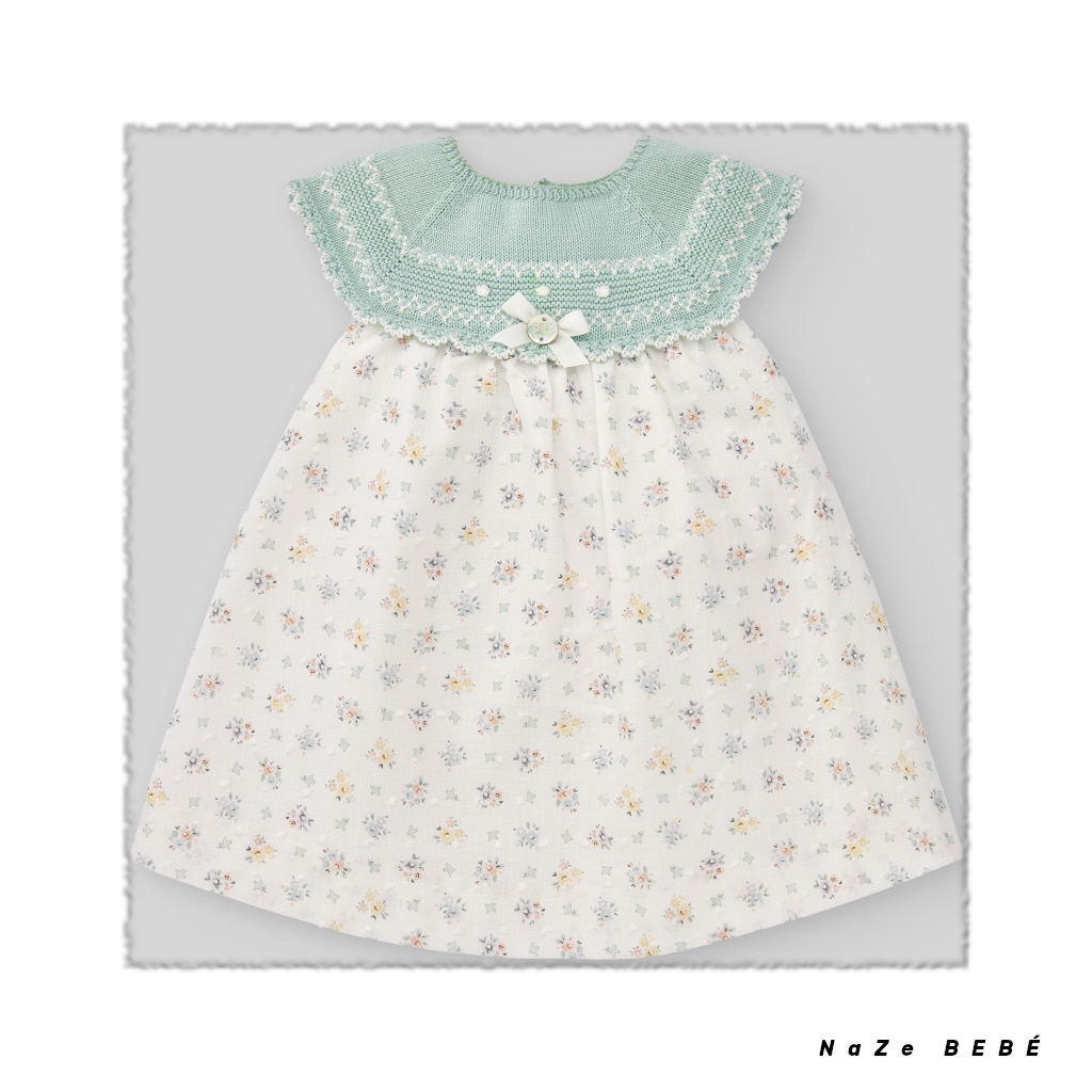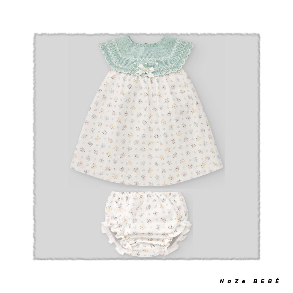 ¡¡REBAJAS 20% DE DESCUENTO!! COLECCIÓN VERANO 2024. Vestido para bebé de punto trabajado en la parte superior combinado con tejido plumeti de estampado floral. Braguita a juego del mismo estampado.