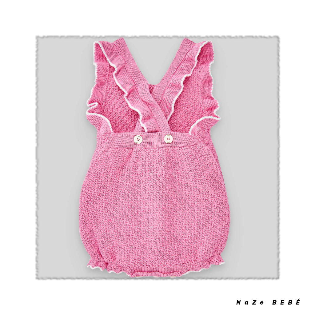 ¡¡REBAJAS 20% DE DESCUENTO!! COLECCIÓN VERANO 2024. Pelele de punto trabajado para bebé niña rematado con detalles en blanco. Espalda cruzada y abertura en la entrepierna para facilitar el cambio de pañal.