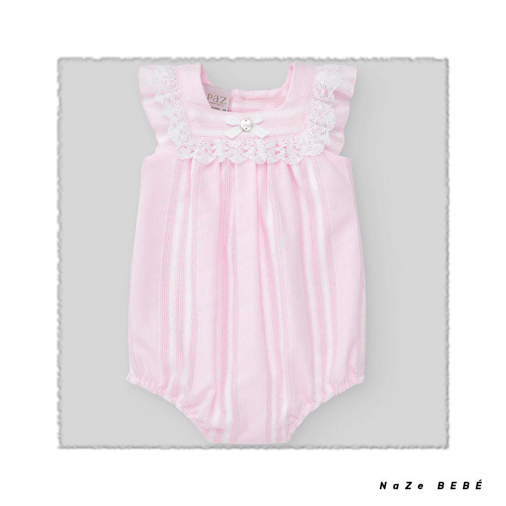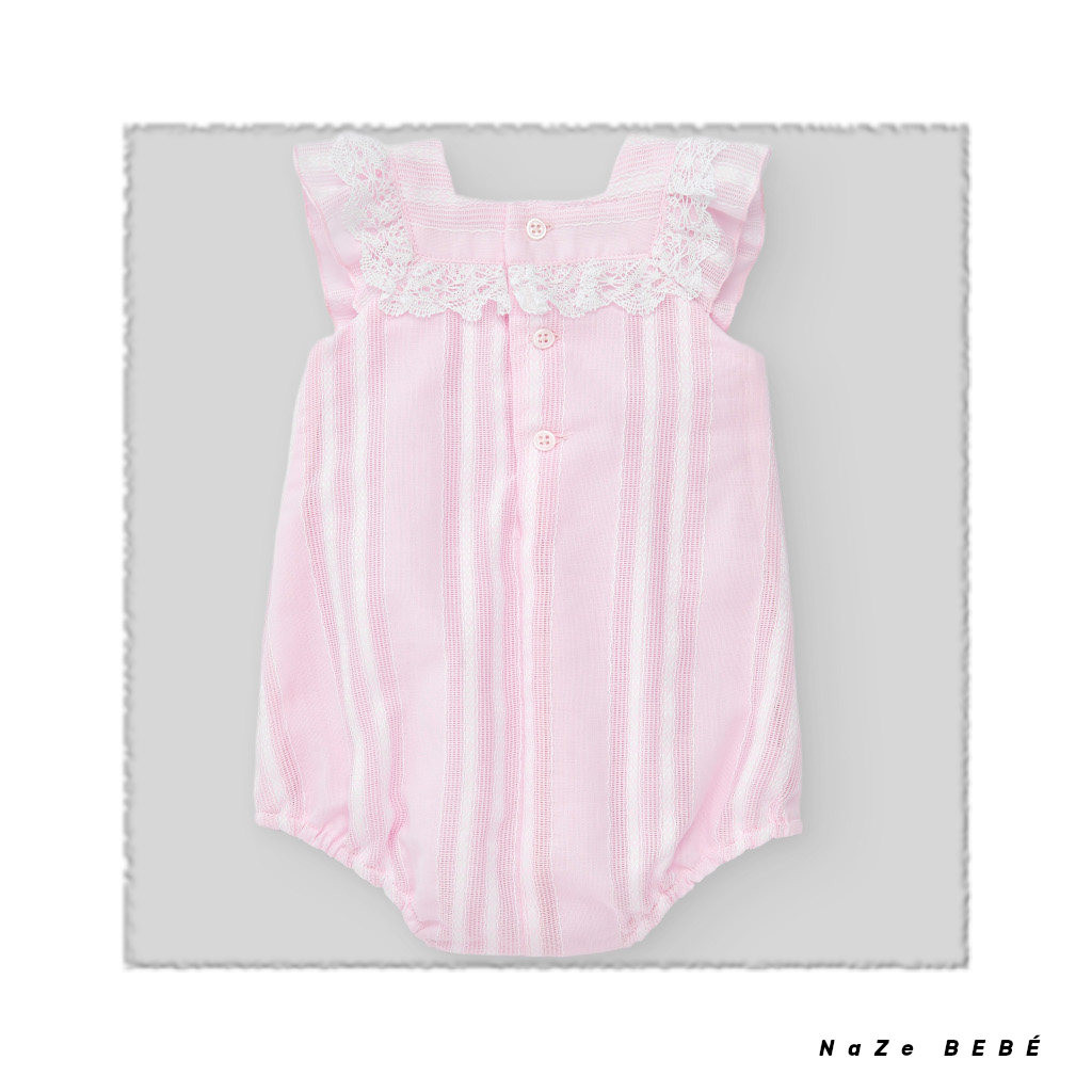 ¡¡REBAJAS 20% DE DESCUENTO!! COLECCIÓN VERANO 2024. Pelele para bebé niña en tejido jacquard rosa tiza con pechero rematado en puntilla a contraste. Pequeño lazo blanco con placa decorativa de la marca.