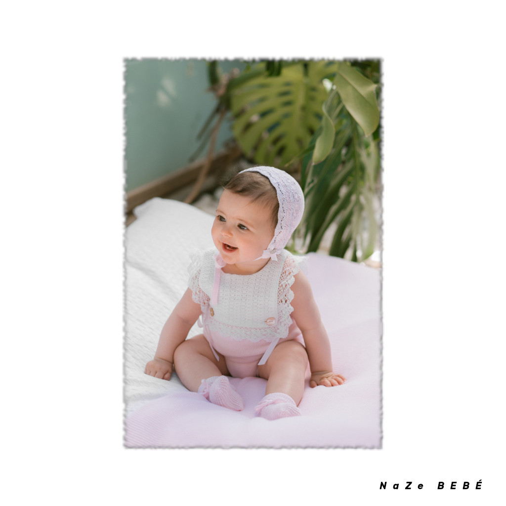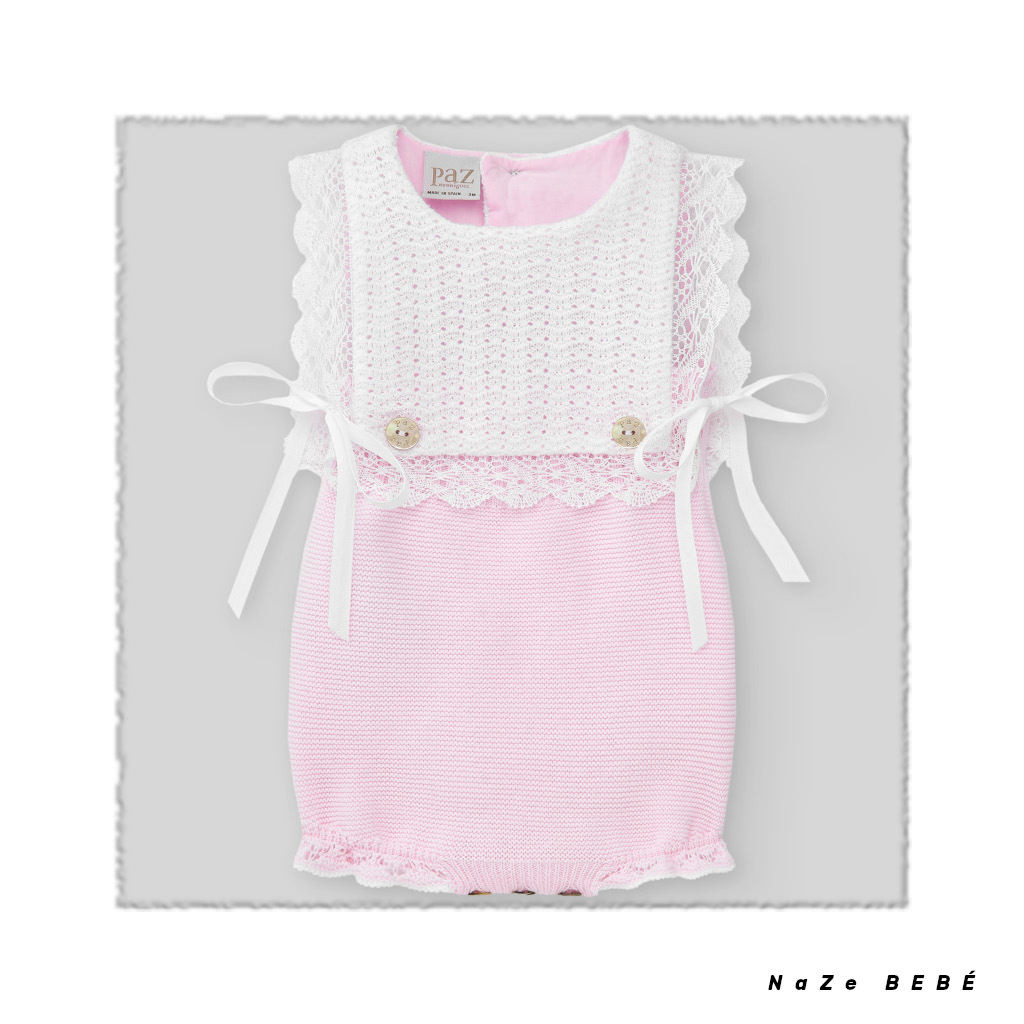 ¡¡REBAJAS 20% DE DESCUENTO!! COLECCIÓN VERANO 2024. Ranita de punto para bebé en rosa tiza y blanco de punto trabajado en pechera rematada con puntilla y con botones decorativos de nácar. Lazadas en ambos lados a contraste en blanco. Abertura en la entrepierna para facilitar el cambio de pañal. Cierre en la espalda.