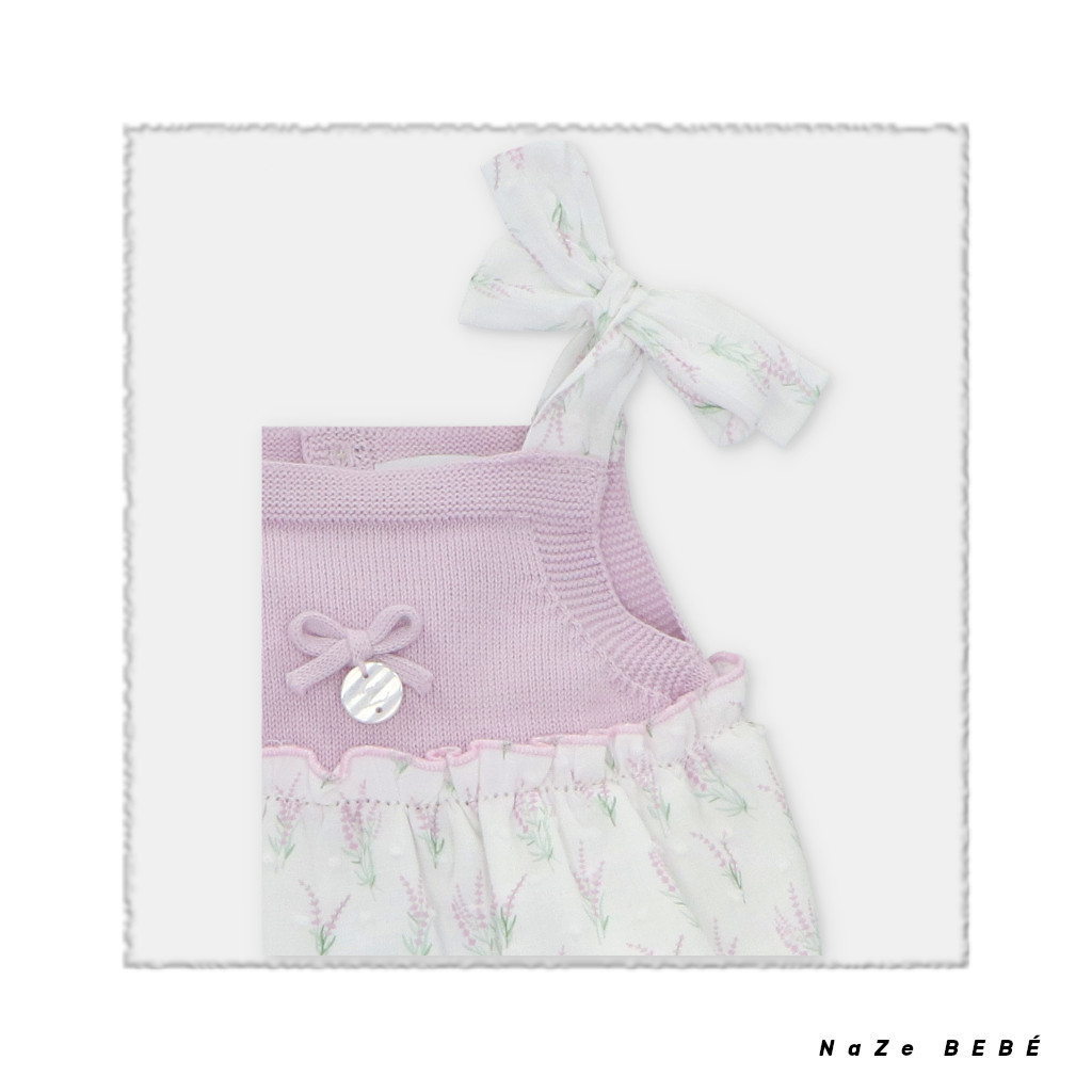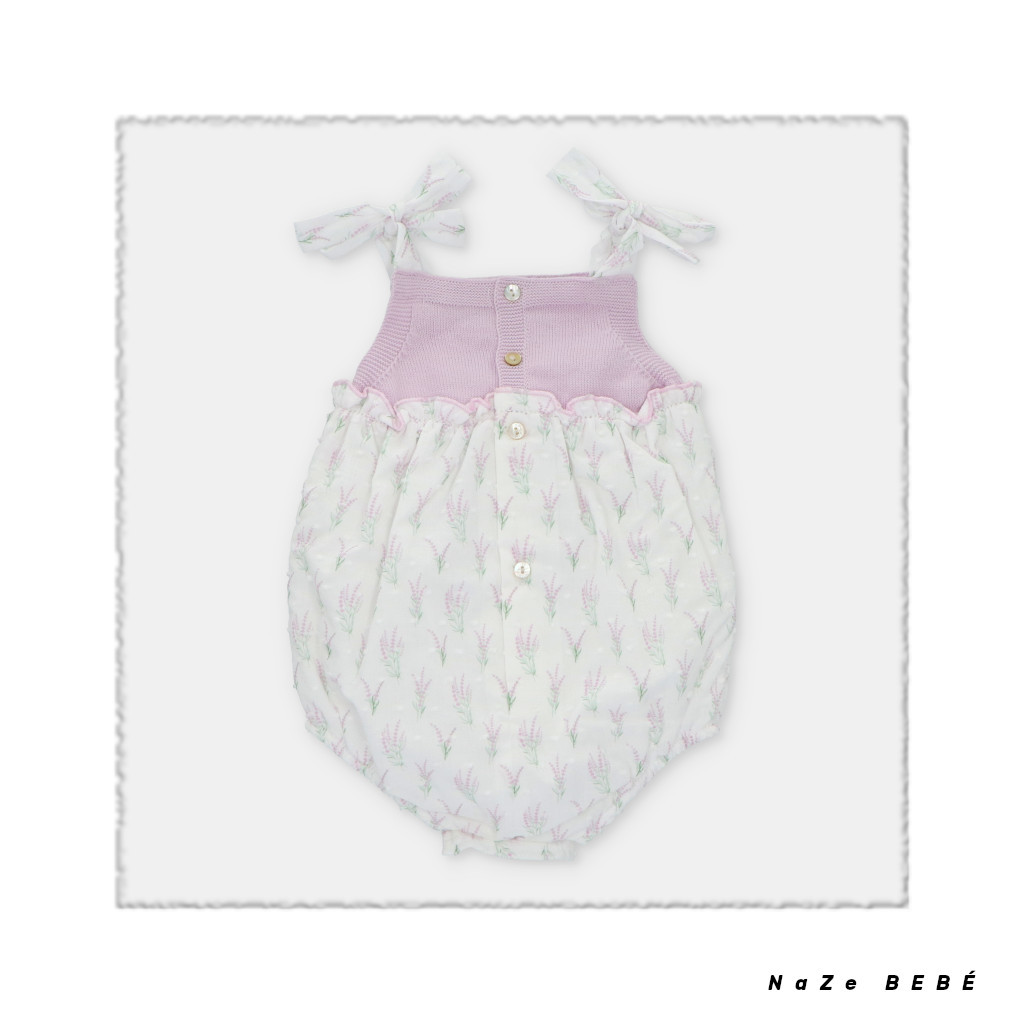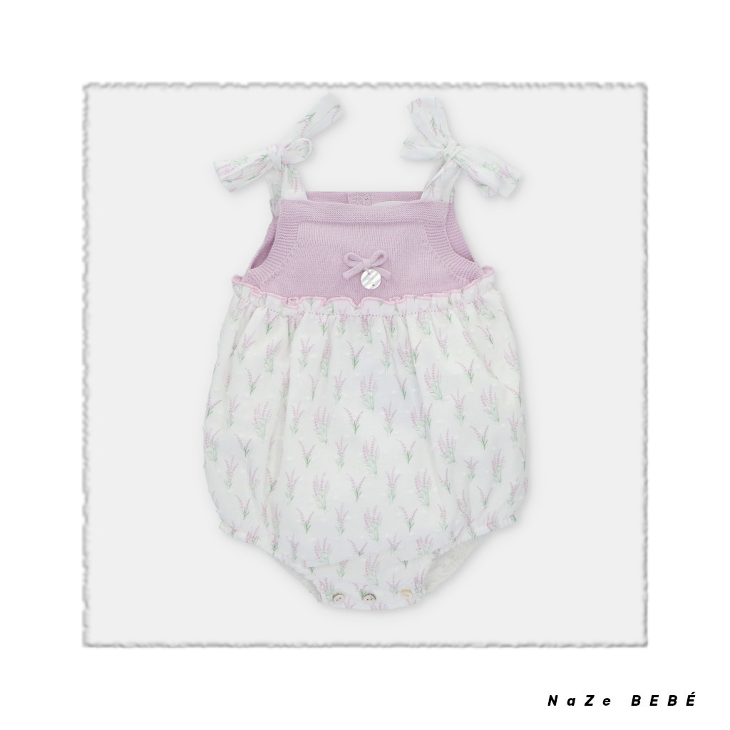 ¡¡REBAJAS 20% DE DESCUENTO!! COLECCIÓN VERANO 2024. Ranita de punto y plana de bebé de tirantes con estructura de punto lins y plumeti microestampado de fantasía, en lavanda. Cierre trasero en la espalda y abertura en la entrepierna para facilitar el cambio de pañal.