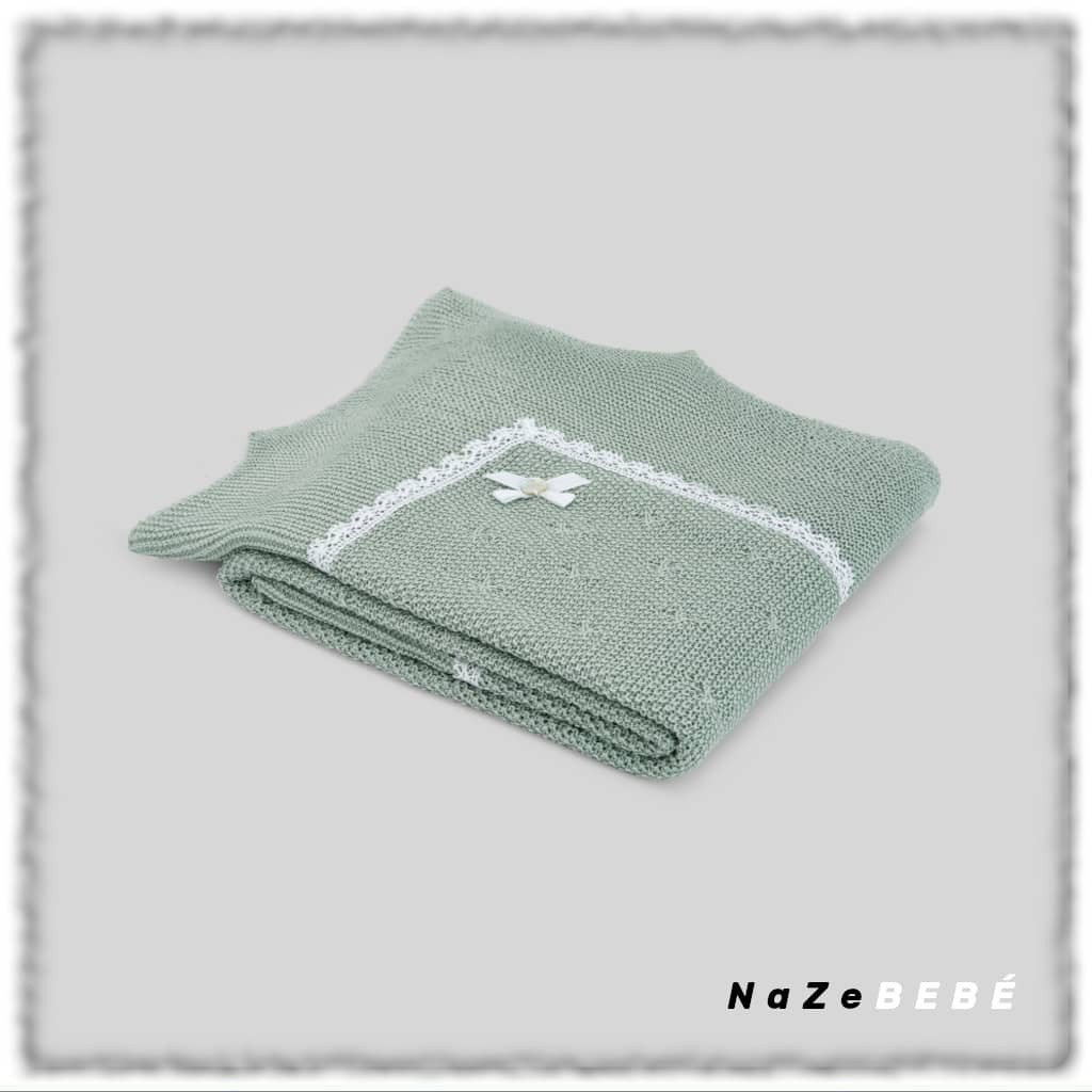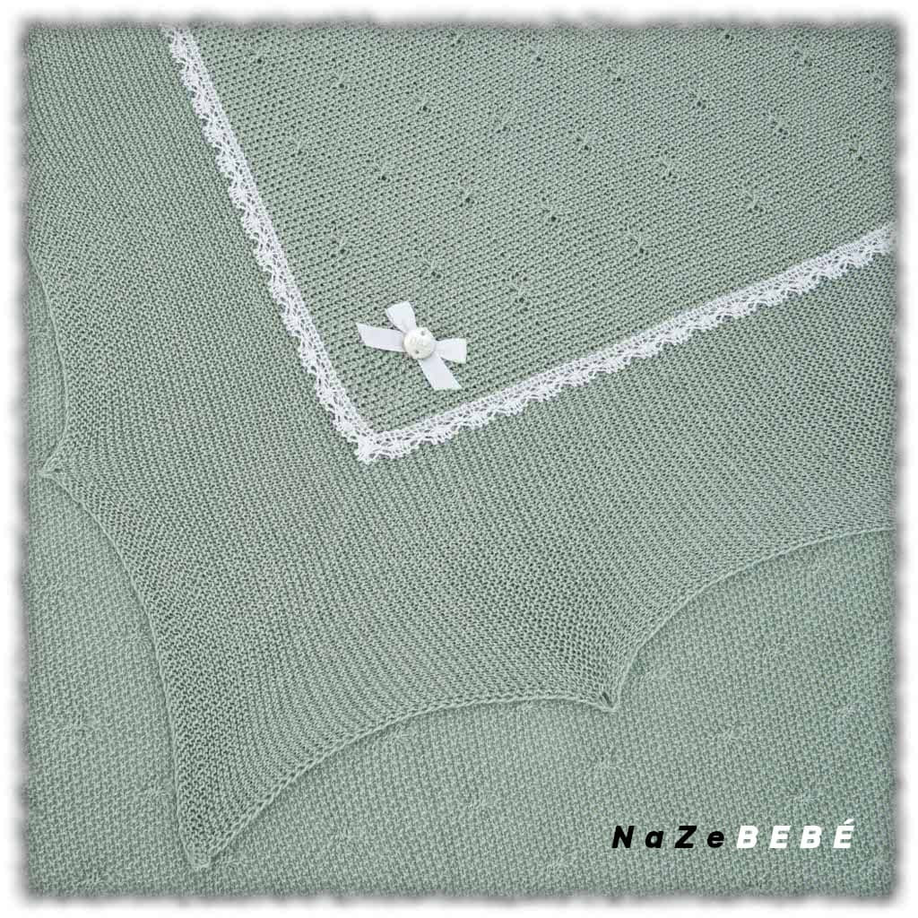 ¡¡OUTLET!! Toquilla para bebé de la marca Paz Rodríguez en verde menta/blanco de punto trabajado con puntilla a contraste en blanco. Pequeño lazo decorativo con placa de la marca.