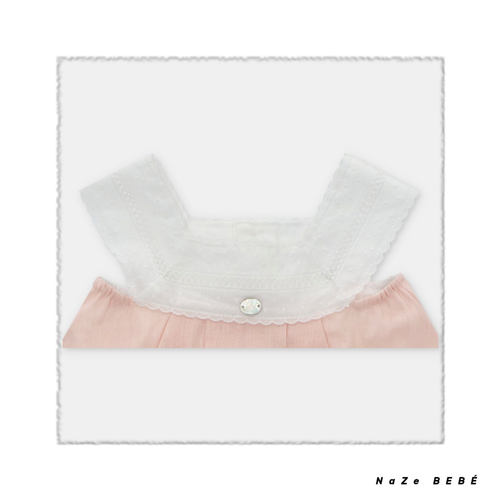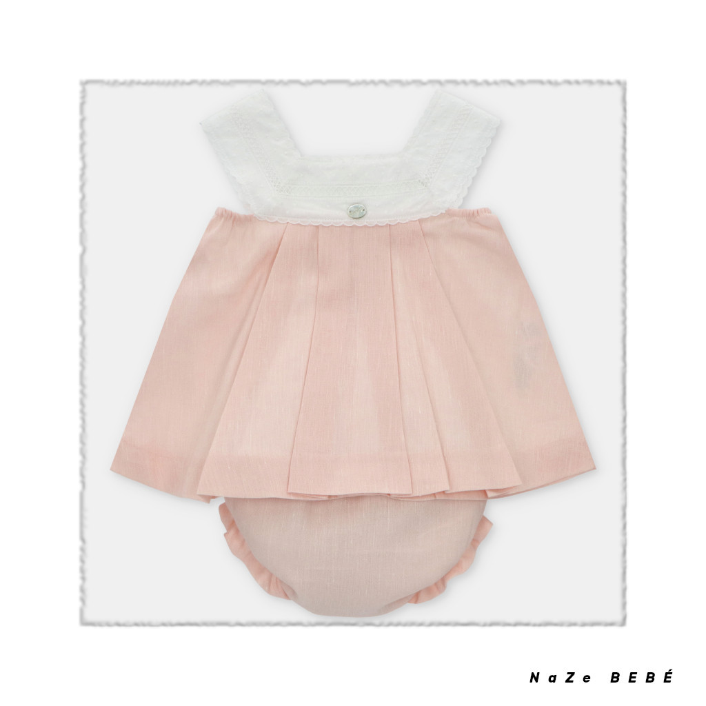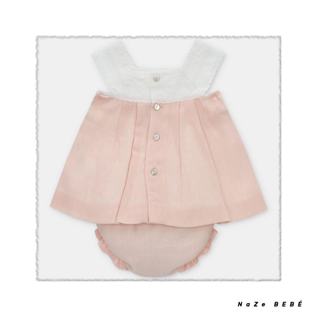 ¡¡REBAJAS 20% DE DESCUENTO!! COLECCIÓN VERANO 2024. Vestido de lino en color rosa empolvado combinado con tela bordada a contraste en parte superior y placa decorativa de la marca. Cierre en la espalda con botones de nácar. Braguitas de lino a juego.
