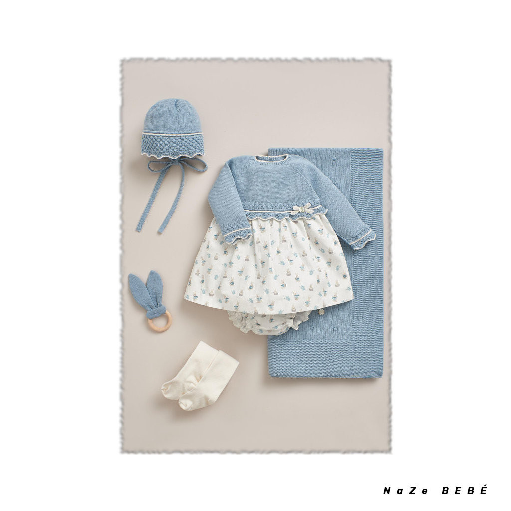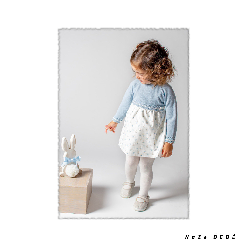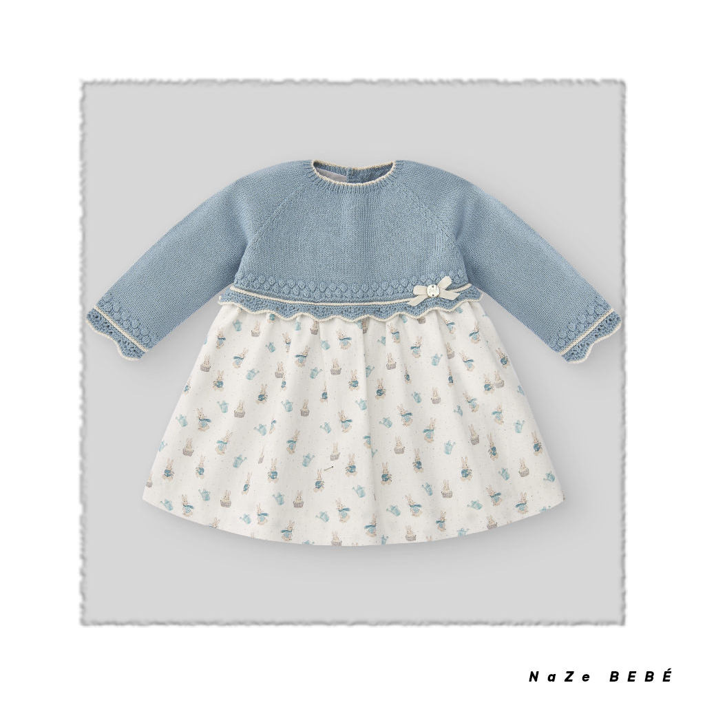 ¡¡REBAJAS 20% DE DTO!! COLECCIÓN INVIERNO 2024. Vestido combinado para bebé de la marca española Paz Rodríguez en azul niebla. Vestido con cuerpo de punto combinado con tejido de algodón estampado de conejitos. Cierre en la espalda con botones a tono.